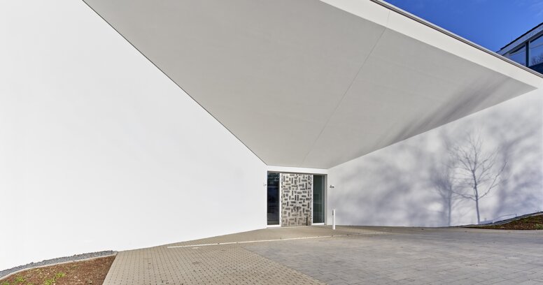 Der präzise eingeschnittene Eingang verdichtet die Architektur zu einem klaren räumlichen Moment. Die trichterförmige Geometrie lenkt den Blick gezielt zum Portal und markiert so den Übergang von außen nach innen.