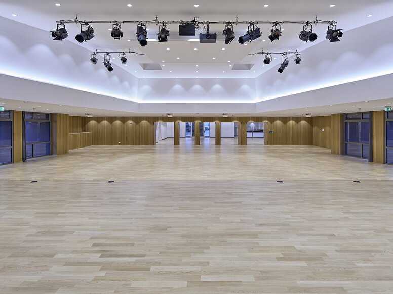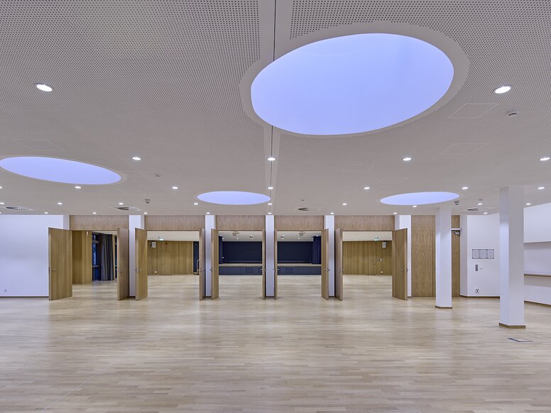 Großzügige Glasfronten an den Seiten lassen Tageslicht in den Saal und stärken die Verbindung zwischen Innenraum, Architektur und Außenraum.
