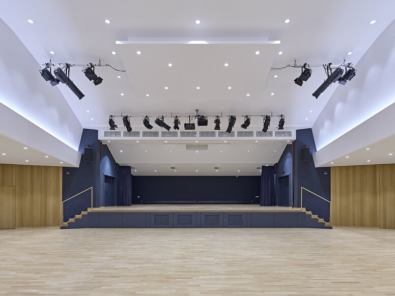 Die Bühne ist als großzügig proportionierter und flexibel nutzbarer Aufführungsraum konzipiert. Ihre klare Geometrie fügt sich in die bestehende Raumstruktur aus den 1970er Jahren ein und ermöglicht zeitgemäße Nutzungsszenarien, ohne dass der Charakter des Saals verändert wird.