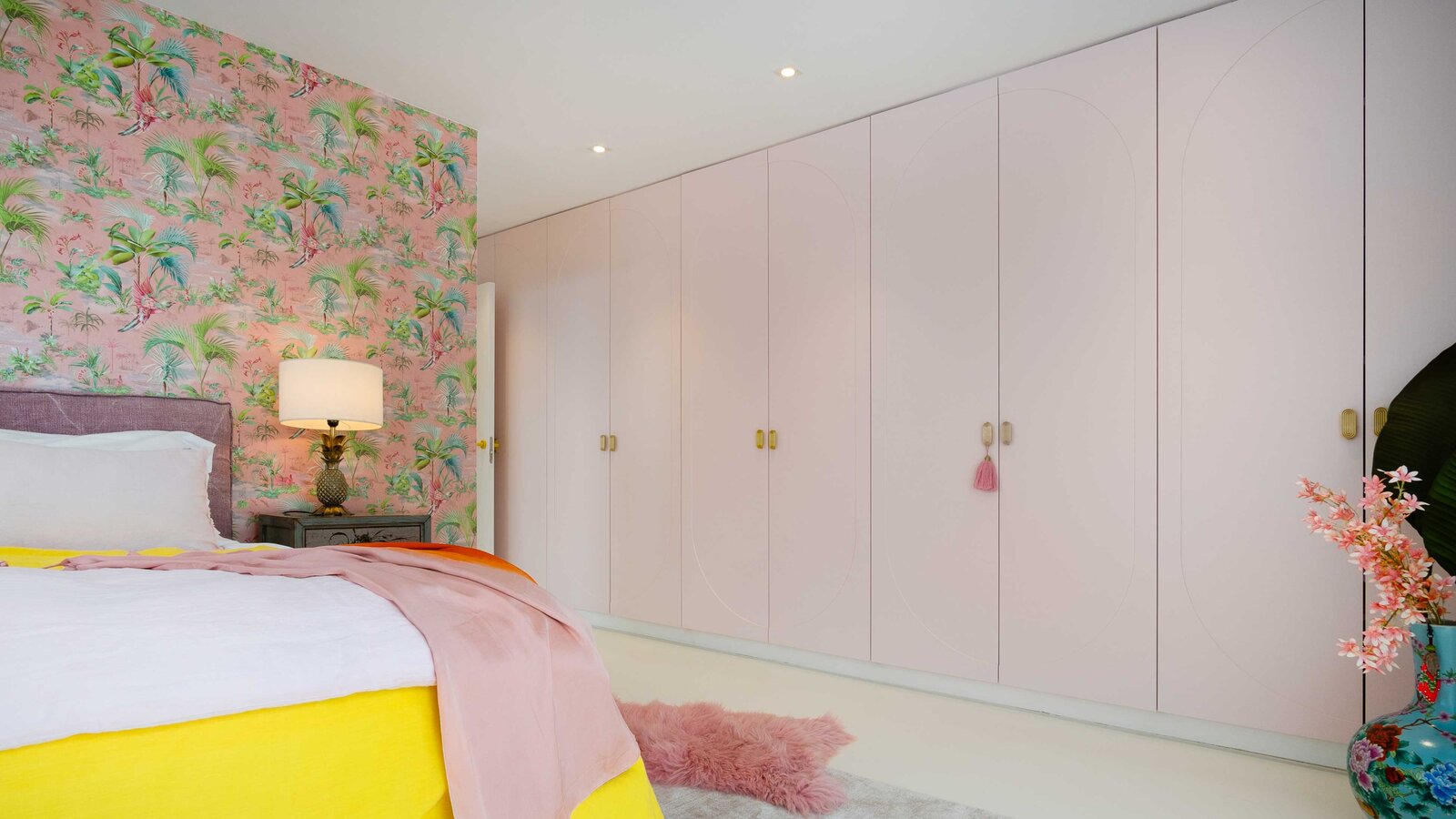 Leja has also played with the harmony of analogue colours (i.e. colours that are close to each other on the colour wheel and have a pleasant and balancing effect to the human eye). Large-format originals by Julio Rondo on the walls, adapted to the colourful interior, unite the complementary colour harmonies of pink-coral and yellow or pink tones from the analogue colour scheme. They also complement the colours of the interior design. In this way, an emotionally touching radiance is created in the room. The diversity and profundity of the colour design continues in the combination of different structures and materials. Smooth (plexi) glass surfaces, mirrors, and metal surfaces meet soft woollen carpets, fluffy sofa cushions, and cosy blankets. With a great deal of courage, free spirit, and sensitivity, Leja combines the most diverse materials and colours and transforms her visions into expressive reality.