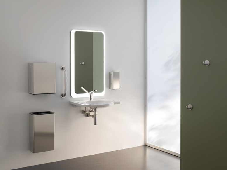 Sanitary Range 805 was developed for use in public spaces. It is characterized by high functionality.For example, level indicators are integrated into the dispenser products to facilitate the stocking of consumables such as soap or paper towels.The choice of materials and design simplify the cleaning of the products. Well thought-out details, such as lockable dispensers or concealed fastenings, protect against theft and vandalism.
