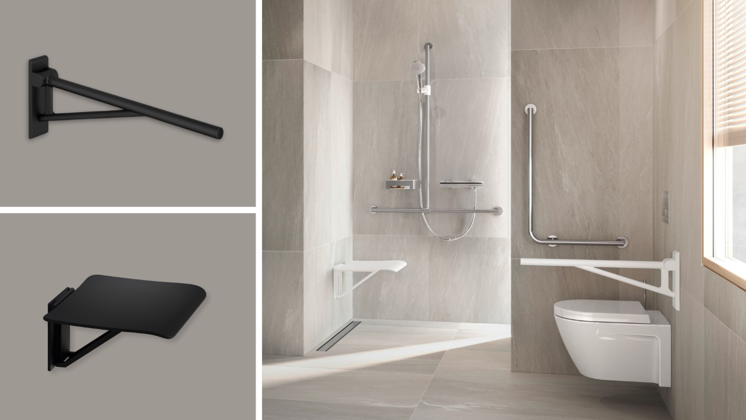 System 162 can be ideally combined with the universal products in classic black and white.The colour variants open up a wide range of design options that can be harmoniously integrated into any bathroom. The fold-up shower seat and the folding support handle offer maximum comfort and safety and can be flexibly adapted to different needs.