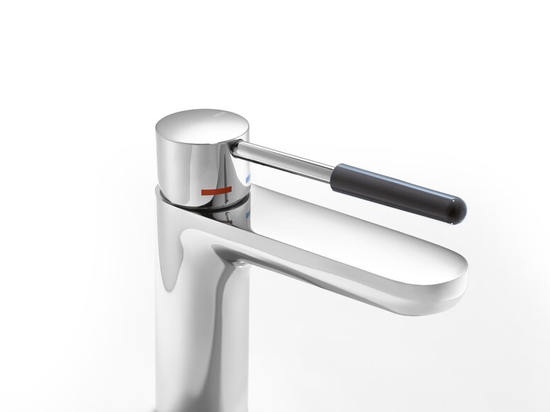 On the soap dispenser, only the push button for dosing the soap is clearly highlighted by the colour contrast. The slightly roughened surface of the push button also makes the functional element palpable.