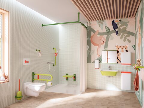 • From washbasins and accessories to fittings, hinged support rails and seats
