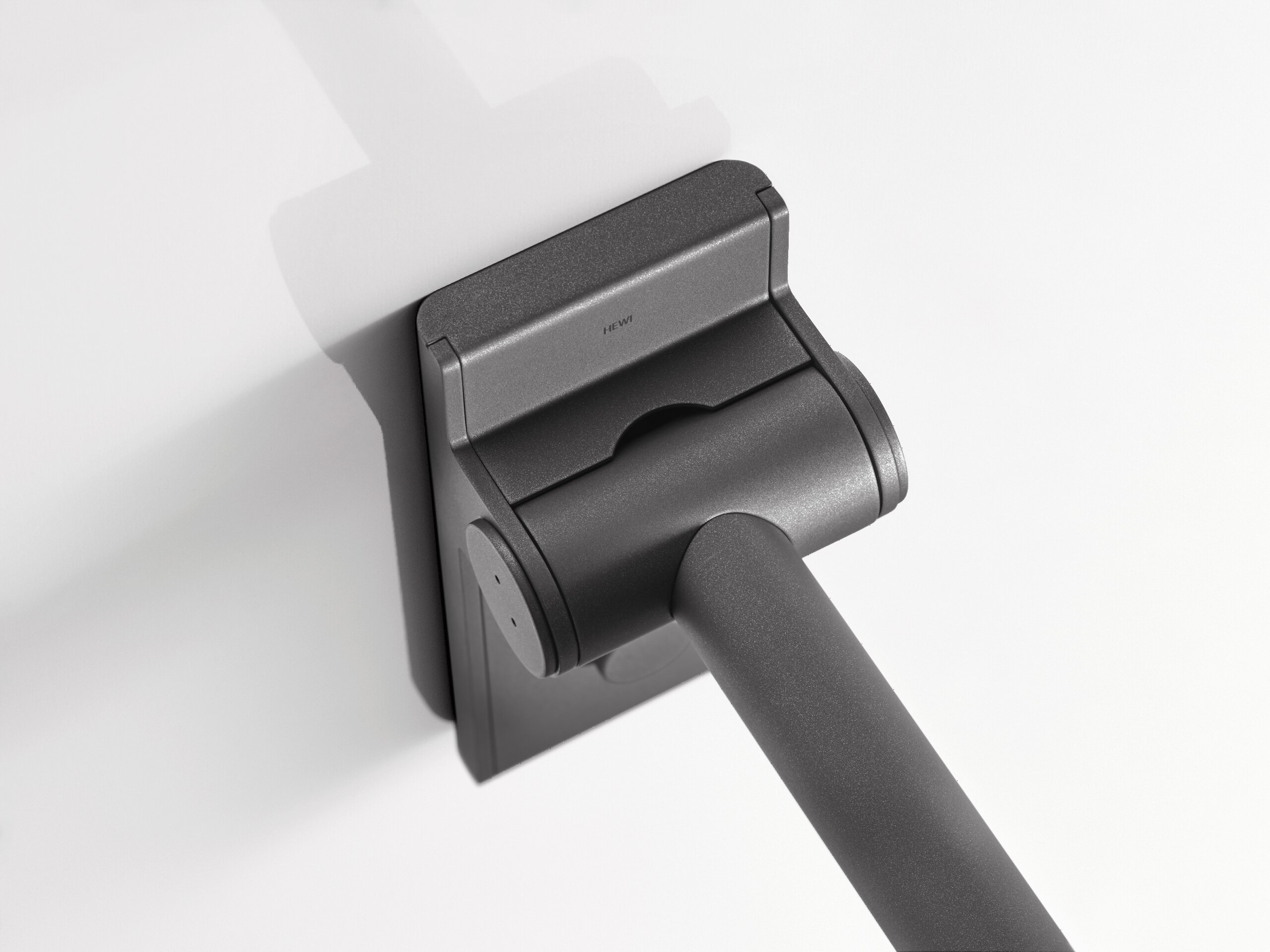 The new HEWI baby changing table combines an easy-to-clean lying surface made of PUR foam in iron grey with robust metal components in matt grain white. The braked fold-down function enables smooth handling, while side hooks and a clamp compartment offer additional comfort and convenience. The changing table combines the highest safety standards and comfortable handling with a modern design that blends seamlessly into public sanitary areas. The baby changing table was designed by Holscher Design, a renowned and award-winning strategic product design agency from Denmark with over 50 years of experience.