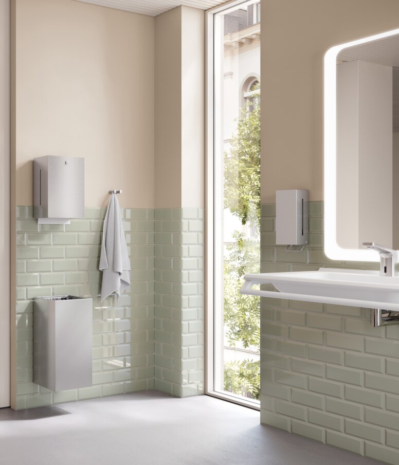Van zeepdispensers en dispensers voor papieren handdoekjes tot hygiënecombinaties en afvalbakken in verschillende afmetingen: HEWI biedt een consistent, functioneel assortiment dat hoge designnormen combineert met duurzame kwaliteit.