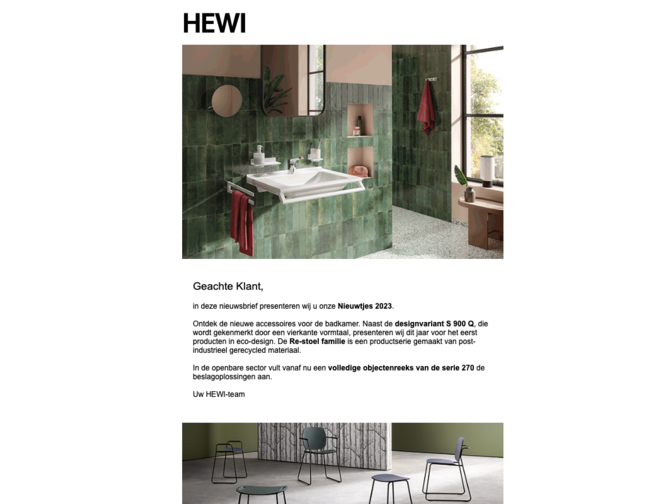 Met de HEWI Newsletter bent u altijd op de hoogte. Maandelijks informeren wij u over verschillende onderwerpen zoals nieuwe producten, technische wijzigingen, brochures en evenementen. Gebruik de HEWI Newsletter, om actuele informatie te verkrijgen en als inspiratie voor toekomstige projecten.